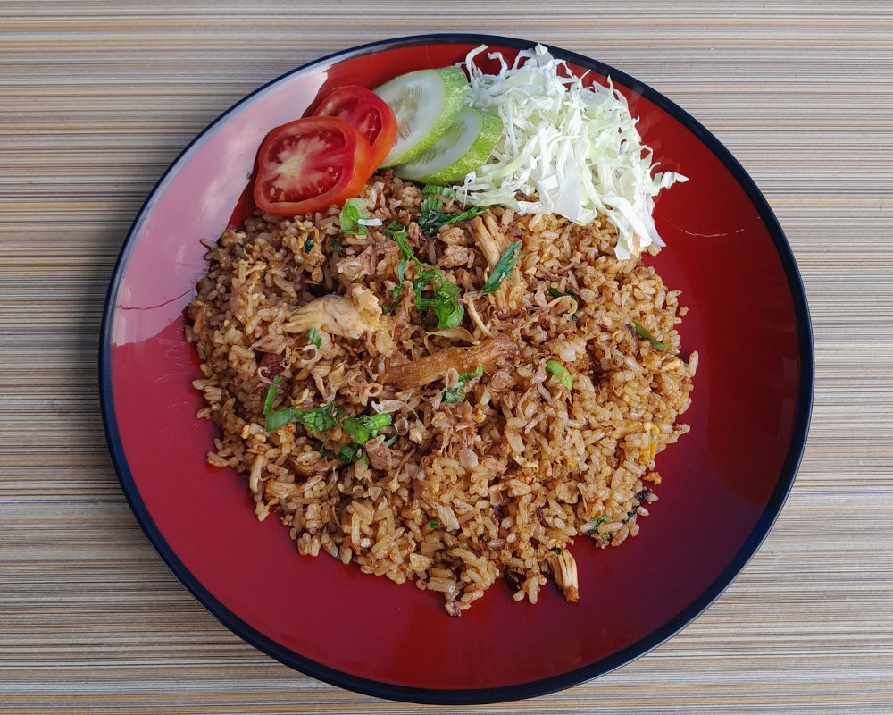 NASI GORENG ADALAH HIDANGAN NASI YANG DIGORENG DAN DICAMPUR DENGAN BERBAGAI BUMBU DAN BAHAN TAMBAHAN. NASI GORENG DISAJIKAN DENGAN TAMBAHAN TELUR, DAGING AYAM, SAYURAN, DAN KERUPUK.