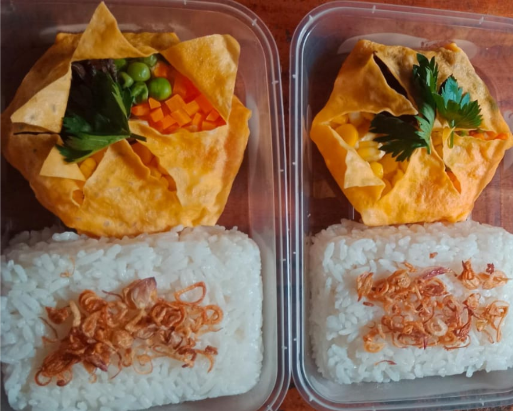 Sop yang terbuat dari adonan ayam & udang, disajikan dengan sayuran, dibalut dengan adonan telur omega